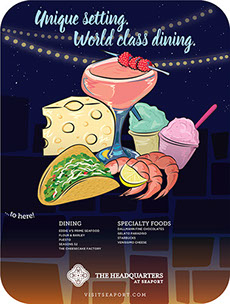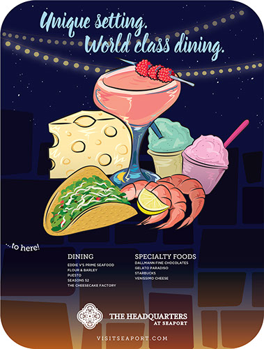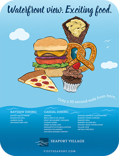 PROJECT: Ad promoting dining for Seaport Village and The Headquarters malls in San Diego. SKILLS: Design, illustration.